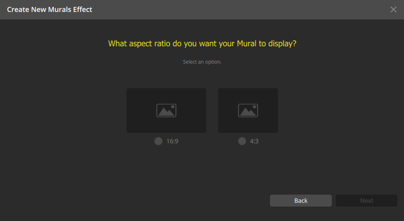 - Da bei dieser Methode alle LEDs ausgeschaltet werden, hat das Seitenverhältnis für die Murals keinen Einfluss auf den nächsten Abschnitt, wählen Sie ein beliebiges Seitenverhältnis und dann Weiter.