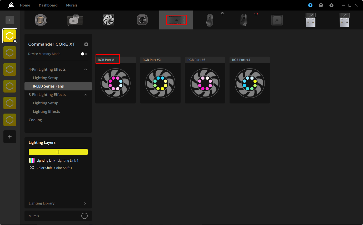 Für jeden Ihrer Lüfter, der mit der Beleuchtungssteuerung verbunden ist, zeigt iCue eine eigene Kachel in iCue an. Diese ist mit dem physischen Anschluss gekennzeichnet, mit der der Lüfter verbunden ist. Jeder Lüfter leuchtet mit einer eigenen Farbe an der gleichen Stelle, um Ihnen die Orientierung und Neuordnung Ihrer Lüfter zu erleichtern.