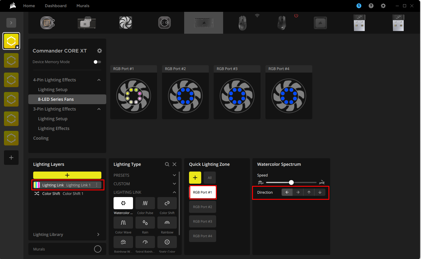 HINWEIS: Alle Änderungen, die Sie an der Beleuchtung und Ausrichtung der Lüfter vornehmen, gelten nur, solange iCUE läuft. Wenn Sie iCUE schließen, kehrt die Beleuchtung Ihrer Lüfter zu ihrer physischen Ausrichtung und Beleuchtungsreihenfolge zurück.