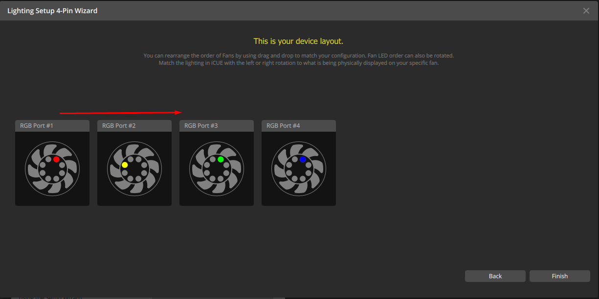 Wenn Sie die Reihenfolge Ihrer Lüfter ändern möchten, müssen Sie diese nicht physisch an den Anschlüssen der Beleuchtungssteuerung umstecken. Wenn Sie den Einrichtungsassistenten durchlaufen, können Sie auf die Vorschaukacheln klicken und hin und her ziehen, um die Reihenfolge der Lüfter zu ändern.