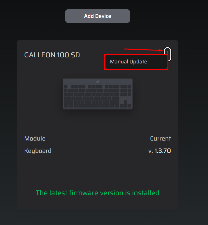 - With the Keyboard Plugged in and detected, select the 3 Vertical Dots on the top right corner of the device tile.